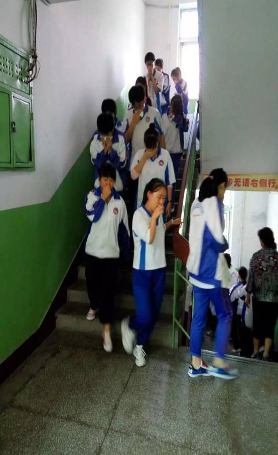 随着防空警报的响起,所有学生迅速蹲下,用毛巾捂住口鼻,在老师的指挥下,有序从楼梯等安全通道逃离,到达操场后,各班学生进行集合,每个班的老师负责清点人数,确保逃生过程中全部人员安全撤离。