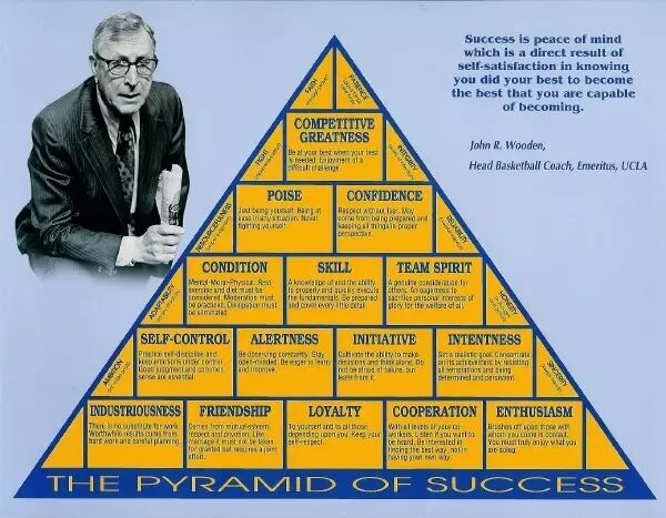 John Wooden 提出了著名的“成功金字塔”概念,列举了成功的要素,勤奋(Industriousness),自控力 (Self Control) 都列在其中